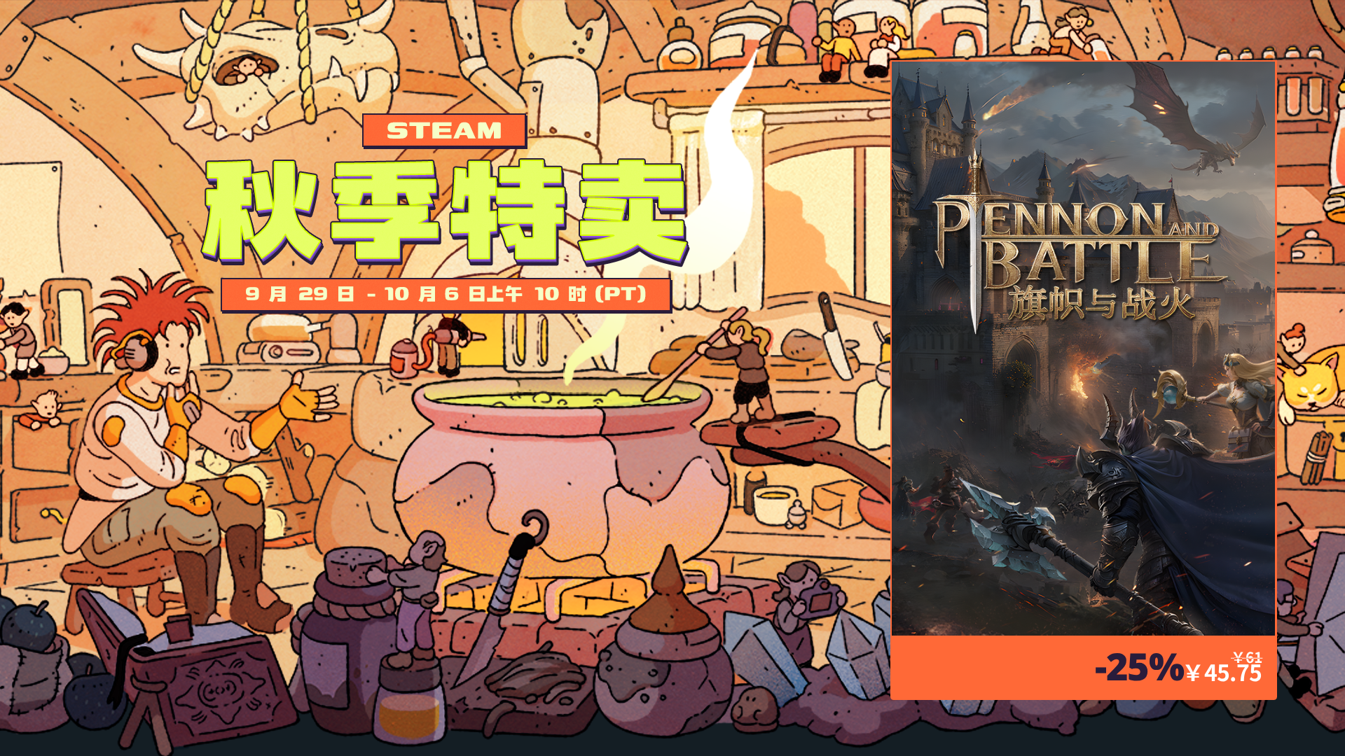 各位领主,《旗帜与战火》即将于北京时间9月30日1:00-10月7日1:00(太平洋标准时间9月29日10:00-10月6日10:00)正式参与Steam的秋季特卖活动,欢迎大家购买!