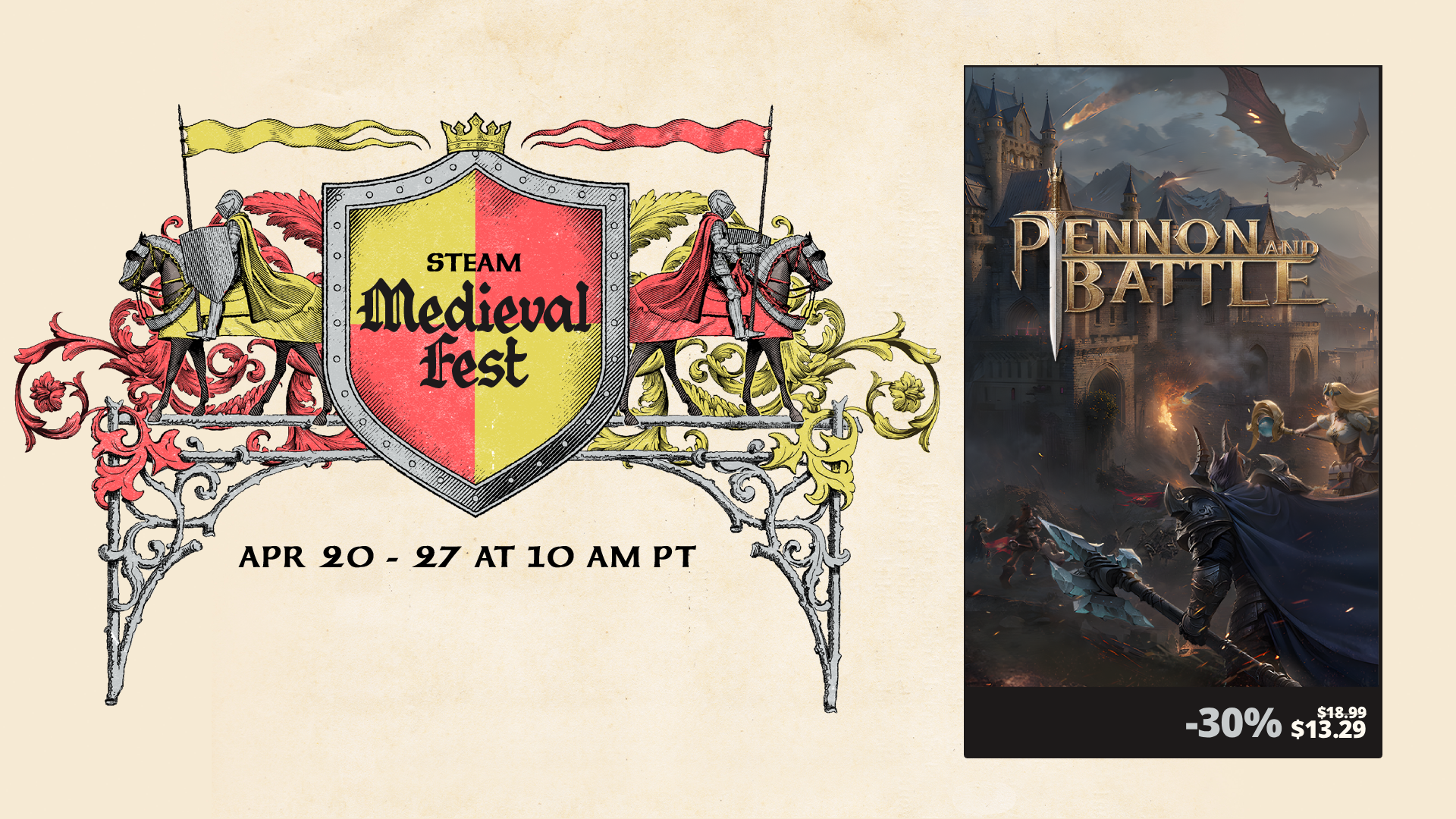 我們非常高興地宣布:《旗幟與戰火》即將於北京時間2026年4月21日1:00至2026年5月5日1:00(太平洋標準時間2026年4月20日10:00-2026年5月4日10:00)參與Steam舉辦的中世紀遊戲節及東方遊戲文化週特賣!